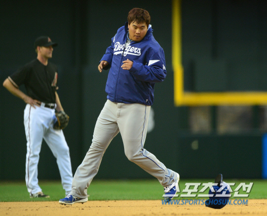 '코리안몬스터' 류현진이 메이저리그 2연승에 도전했다. LA다저스 류현진은 14일(한국시간) 미국 애리조나주 피닉스의 체이스필드에서 열린 애리조나 다이아몬드백스(D-백스)와 원정 경기에 선발로 출전 했다. 5회 안타를 치고 나간 류현진이 크로포드의 내야 땅볼 타구 때 2루에 힘차게 달리고 있다. 헬멧이 벗겨지는 상황에서도 전력질주 하고 있는 류현진.