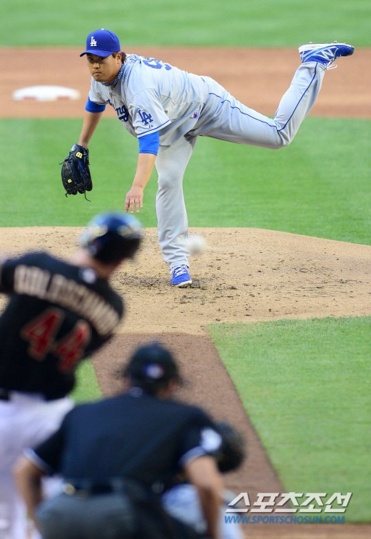 '코리안몬스터' 류현진이 메이저리그 2연승에 도전했다. LA다저스 류현진은 14일(한국시간) 미국 애리조나주 피닉스의 체이스필드에서 열린 애리조나 다이아몬드백스(D-백스)와 원정 경기에 선발로 출전 했다. 마운드에서 류현진이 D-백스 선수들을 상대로 힘차게 볼을 던지고 있다. 2회 골드슈미츠를 상대로 투구하고 있는 류현진.