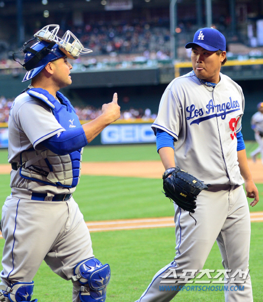 '코리안몬스터' 류현진이 메이저리그 2연승에 도전했다. LA다저스 류현진은 14일(한국시간) 미국 애리조나주 피닉스의 체이스필드에서 열린 애리조나 다이아몬드백스(D-백스)와 원정 경기에 선발로 출전 했다. 3회를 마치고 마운드를 내려오며 류현진이 에르난데스 포수와 하이파이브를 나누고 있다.