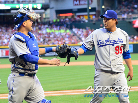 '코리안몬스터' 류현진이 메이저리그 2연승에 도전했다. LA다저스 류현진은 14일(한국시간) 미국 애리조나주 피닉스의 체이스필드에서 열린 애리조나 다이아몬드백스(D-백스)와 원정 경기에 선발로 출전 했다. 3회를 마치고 마운드를 내려오며 류현진이 에르난데스 포수와 하이파이브를 나누고 있다.