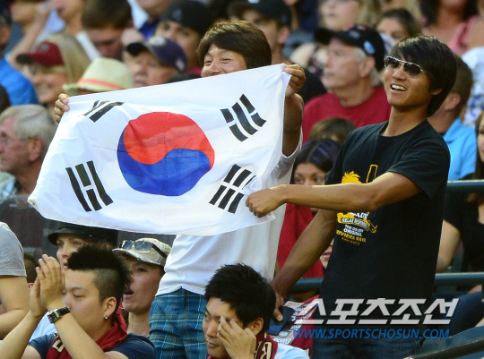 '코리안몬스터' 류현진이 메이저리그 2연승에 도전했다. LA다저스 류현진은 14일(한국시간) 미국 애리조나주 피닉스의 체이스필드에서 열린 애리조나 다이아몬드백스(D-백스)와 원정 경기에 선발로 출전 했다. 6회 류현진이 득점에 성공하자 경기장을 찾은 한인들이 태극기 응원을 펼치고 있다.