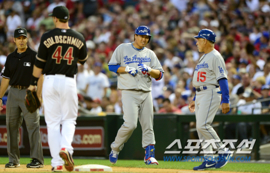 '코리안몬스터' 류현진이 메이저리그 2연승에 도전했다. LA다저스 류현진은 14일(한국시간) 미국 애리조나주 피닉스의 체이스필드에서 열린 애리조나 다이아몬드백스(D-백스)와 원정 경기에 선발로 출전 했다. 6회 안타를 치며 3안타를 기록한 류현진이 1루에서 웃음을 보이고 있다.