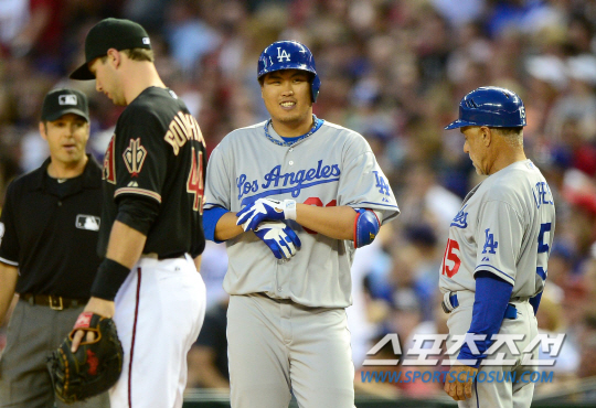 '코리안몬스터' 류현진이 메이저리그 2연승에 도전했다. LA다저스 류현진은 14일(한국시간) 미국 애리조나주 피닉스의 체이스필드에서 열린 애리조나 다이아몬드백스(D-백스)와 원정 경기에 선발로 출전 했다. 6회 안타를 치며 3안타를 기록한 류현진이 1루에서 웃음을 보이고 있다.