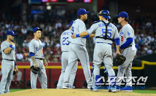 '코리안몬스터' 류현진이 메이저리그 2연승에 도전했다. LA다저스 류현진은 14일(한국시간) 미국 애리조나주 피닉스의 체이스필드에서 열린 애리조나 다이아몬드백스(D-백스)와 원정 경기에 선발로 출전 했다. 7회 무사 1,2루에서 류현진이 마운드를 내려오고 있다. 매팅리 감독에게 볼을 건내고 있는 류현진. 후속 주자들이 득점에 성공해 류현진은 6이닝 3실점 했다.