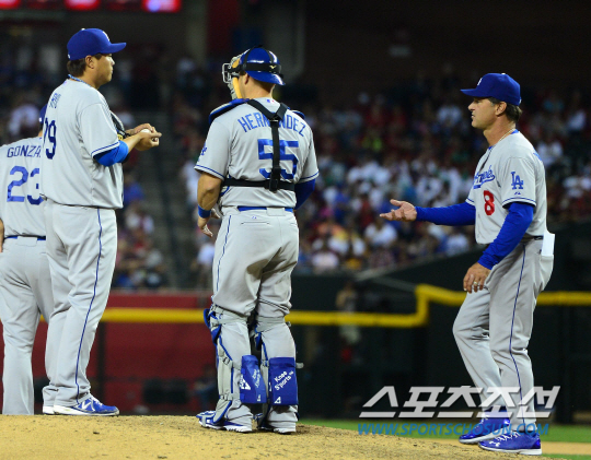 '코리안몬스터' 류현진이 메이저리그 3연속 퀄리티 피칭을 선보이며 시즌 2승을 챙겼다. LA다저스 류현진은 14일(한국시간) 미국 애리조나주 피닉스의 체이스필드에서 열린 애리조나 다이아몬드백스와 원정 경기에 선발 출전 했다. 류현진은 6이닝 6안타 9삼진 3실점 했으며, 타석에서도 3타수 3안타를 선보이는 맹활약 끝에 승리 투수가 됐다. 7회 매팅리 감독(오른쪽)이 마운드에 올라 류현진의 볼을 건내 받고 있다.