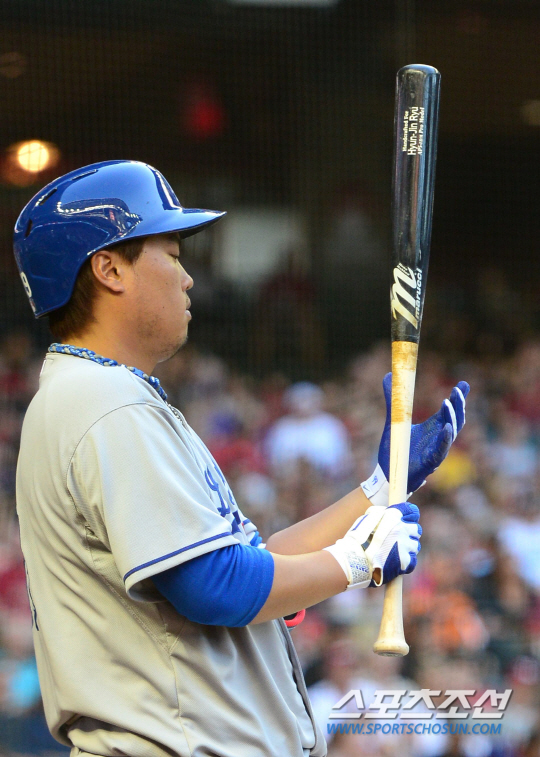 '코리안몬스터' 류현진이 메이저리그 3연속 퀄리티 피칭을 선보이며 시즌 2승을 챙겼다. LA다저스 류현진은 14일(한국시간) 미국 애리조나주 피닉스의 체이스필드에서 열린 애리조나 다이아몬드백스와 원정 경기에 선발 출전 했다. 류현진은 6이닝 6안타 9삼진 3실점 했으며, 타석에서도 3타수 3안타를 선보이는 맹활약 끝에 승리 투수가 됐다. 2회 타석에 나서기 전 류현진이 방망이를 바라보고 있다.