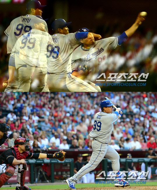 류현진은 타석에서도 맹타를 터뜨리며 '원맨쇼'를 펼쳤다. 류현진은 3회 첫 타석에서 우익수 키를 넘기는 2루타로 메이저리그 데뷔 첫 안타를 신고했다. 상대 선발 이안 케네디의 93마일짜리 바깥쪽 높은 직구를 밀어쳐 라인드라이브 타구를 날렸다. 5회에는 선두타자로 나가 중전안타를 날린 뒤 후속타때 2루에서 포스아웃됐다. 3-1로 앞선 6회에는 2사후 우전안타를 날린 뒤 후속타때 홈을 밟아 메이저리그 첫 득점까지 올렸다. 다저스 투수가 한 경기서 3안타를 때린 것은 지난 2009년 8월17일 랜디 울프가 애리조나전에서 4타수 3안타를 친 이후 4년만이다.