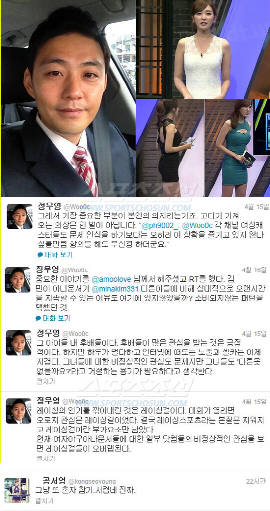 정우영 아나운서는 15일 자신의 트위터에 "레이싱의 인기를 깎아내린 것은 레이싱걸이다. 대회가 열리면 오로지 관심은 레이싱걸이었다. 결국 레이싱스포츠라는 본질은 지워지고 레이싱걸이란 부가요소만 남았다. 현재 여자야구아나운서들에 대한 일부 닷컴들의 비정상적인 관심을 보면 레이싱걸들이 오버랩 된다"라고 말문을 열었다.