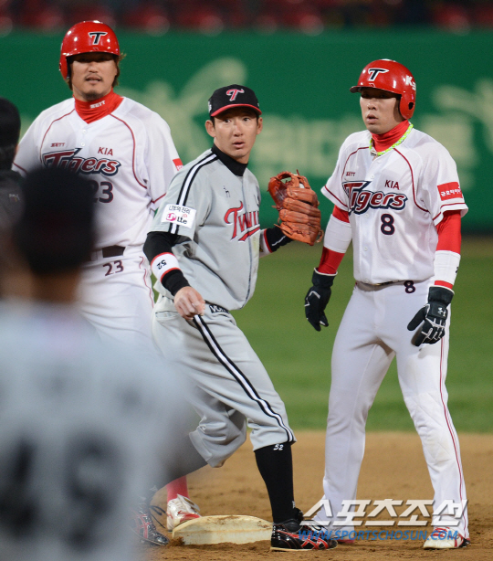 LG 트윈스와 KIA 타이거즈의 2013 프로야구 경기가 18일 광주구장에서 열렸다. 3회말 무사 만루 KIA 김상현의 3루수앞 땅볼 때 2루에 머문 최희섭과 1루에서 2루까지 자동진루한 안치홍이 2루 베이스에 함께 서있다. 결과는 안치홍의 2루 포스아웃. 광주=정재근기자 cjg@sportschosun.com/2013.04.18/