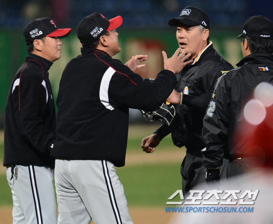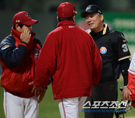 LG 트윈스와 KIA 타이거즈의 2013 프로야구 경기가 18일 광주구장에서 열렸다. 3회말 무사 만루 KIA 김상현의 3루수앞 땅볼 때 LG 김기태 감독이 나와 판정에 항의하자 KIA 선동열 감독도 나와 항의하고 있다. 광주=정재근기자 cjg@sportschosun.com/2013.04.18/