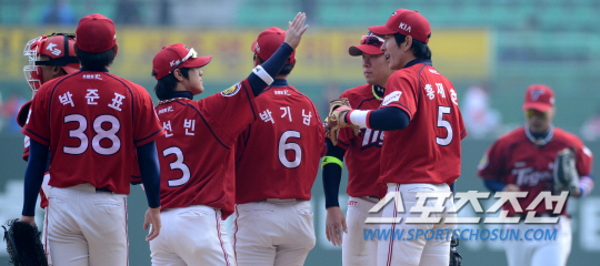 SK와 KIA의 2013 프로야구 주말 3연전 마지막날 경기가 21일 인천 문학구장에서 열렸다. 9대0으로 승리를 거둔 KIA 선수들이 하이파이브를 하고 있다. 인천=허상욱 기자 wook@sportschosun.com/2013.04.21/