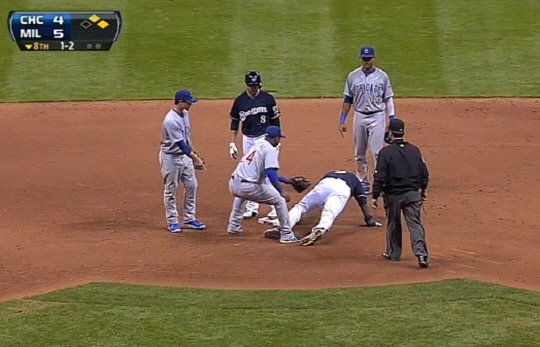 5-4로 앞선 8회말 무사에서 1루 주자인 밀워키 유격수 진 세구라가 2루 도루에 성공했다. 타석의 라이언 브라운이 볼넷을 얻어 무사 1-2루 상황.