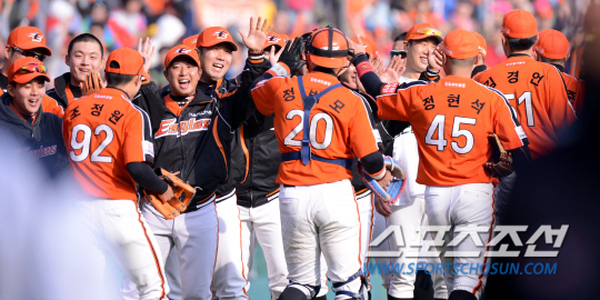 | 올시즌 팀수가 9개로 늘어난데다 팀간 전력 편차가 커지면서 페넌트레이스 우승과 4강 승률이 높아질 것이란 전망이 나오고 있는 가운데 하위권 팀들의 분발이 요구되고 있다. 지난 21일 잠실 두산전서 승리를 거둔 한화 선수들. 잠실=조병관기자 rainmaker@sportschosun.com |