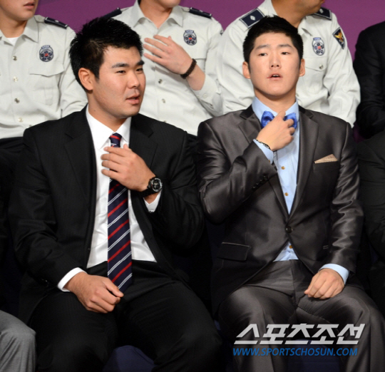 SK 이재원과 박희수가 지난해 프로야구 MVP 시상식장에서 옷 매무새를 고치는 모습. 둘은 부상에서 벗어나 곧 SK의 4번과 마무리를 맡을 것으로 예상된다. 허상욱 기자 wook@sportschosun.com