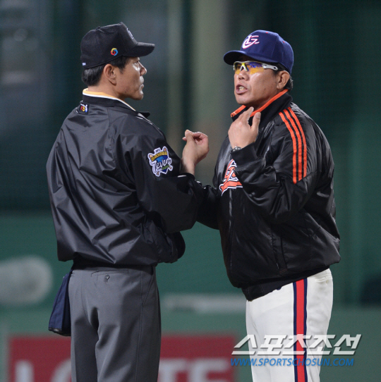 24일 부산 사직야구장에서 2013 프로야구 SK와 롯데의 경기가 열렸다. 7회말 1사 1루서 SK 통역사가 마운드에 올라 레이예스와 이야기를 나눈것에 대해 롯데 김시진 감독이 항의하고 있다. 부산=김경민 기자 kyungmin@sportschosun.com