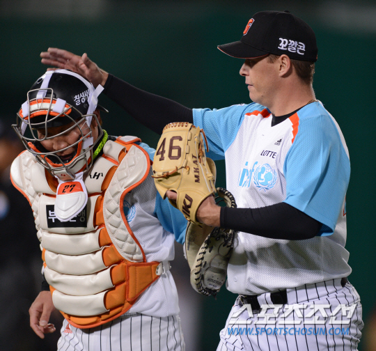 25일 부산 사직야구장에서 2013 프로야구 SK와 롯데의 경기가 열렸다. 7회초 수비를 마친 롯데 옥스프링(오른쪽)이 포수 용덕한의 머리를 두드리고 있다. 부산=김경민 기자 kyungmin@sportschosun.com / 2013.04.25. |