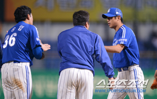 26일 광주 무등야구장에서 2013 프로야구 삼성과 KIA의 경기가 열렸다. 9이닝 4안타 무실점으로 KIA 타선을 꽁꽁 묶으며 완봉승을 거둔 삼성 윤성환이 시합이 끝난 후 동료들과 하이파이브를 나누고 있다. 광주=김경민 기자 kyungmin@sportschosun.com / 2013.04.26.