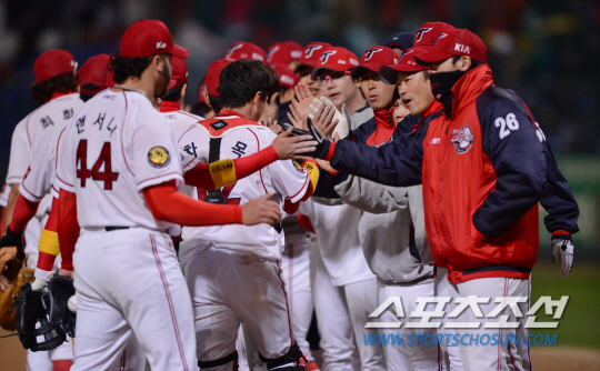 | 27일 광주 무등야구장에서 2013 프로야구 삼성과 KIA의 경기가 열렸다. 5대1로 승리한 KIA 선수들이 하이파이브를 나누고 있다. 광주=김경민 기자 kyungmin@sportschosun.com / 2013.04.27. |