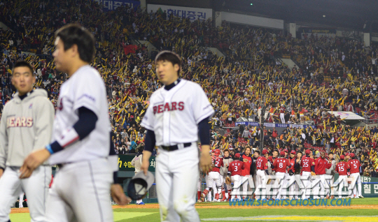 | KIA가 30일 잠실 두산전서 5대3으로 승리하며 선두를 지켰다. 최근 6년간 사례를 봤을 때 KIA는 포스트시즌에 탈락할 확률이 희박하다. 경기후 3루 덕아웃 앞에서 하이파이브를 나누고 있는 KIA 선수들. 잠실=송정헌 기자 songs@sportschosun.com |