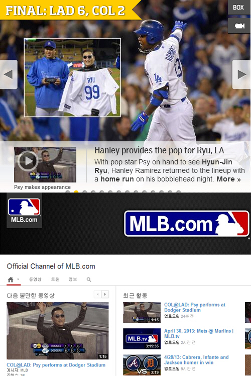 MLB 공식 홈페이지와 공식 유튜브 채널, LA다저스 홈페이지는 모두 싸이의 즉석 공연과 류현진의 역투를 메인 페이지에 게재하며 비중있게 다뤘다.