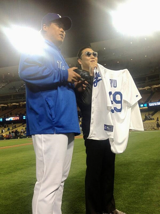 공개한 사진은 LA 다저스타디움에서 열린 콜로라도 로키츠와의 류현진 선발 경기에 응원을 간 싸이가 경기가 끝난 후 류현진에게 직접 유니폼을 받는 장면이다. 그라운드에 나란히 선 두 사람의 훈훈한 우정이 빛을 발했으며, 특히 싸이가 류현진의 큰 유니폼 상의를 들고 있는 귀여운 모습이 눈길을 끈다.