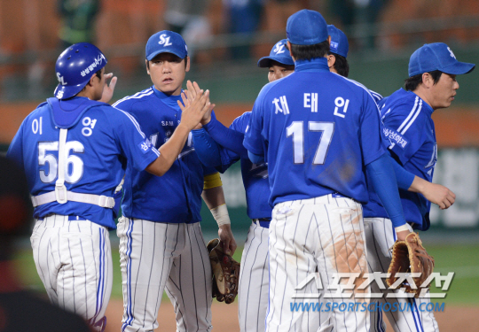 롯데 자이언츠와 삼성 라이온즈의 2013 프로야구 경기가 3일 부산 사직야구장에서 열렸다. 삼성 선수들이 롯데 원정에서 10대3 대승을 거둔후 하이파이브 하고있다. 부산=최문영 기자 deer@sportschosun.com /2013.05.03/ |
