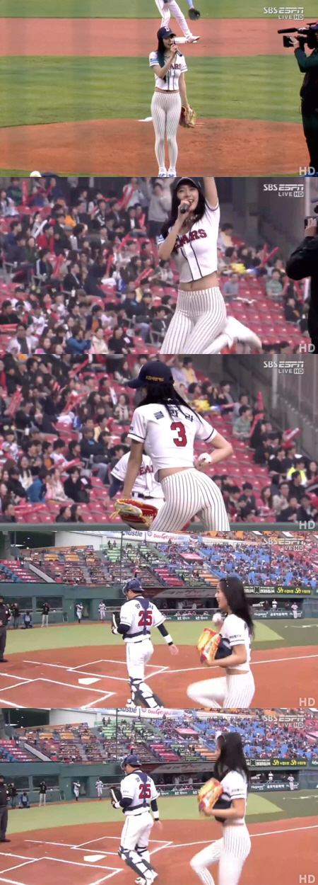 또 클라라는 요염한 'S라인' 포즈를 취한 채 포수 양의지와 사인을 주고받은 뒤 멋진 시구를 선보였다. 시구를 끝낸 후 클라라는 관계자들로부터 "잘했다"는 칭찬을 받자 기분이 좋은 듯 또 한 번 귀엽게 폴짝폴짝 뛰어 보는 이들의 미소를 자아냈다.