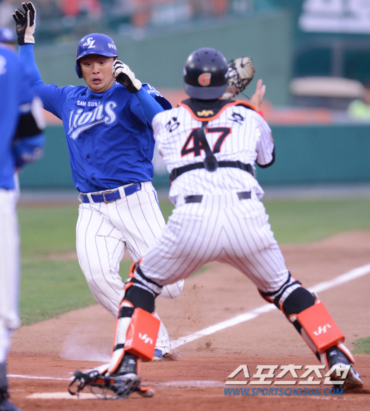 롯데 자이언츠와 삼성 라이온즈의 2013 프로야구 경기가 3일 부산 사직야구장에서 열렸다. 삼성 1회초 무사 1,3루에서 3루주자 박한이가 1루주자 이승엽의 도루를 틈타 홈에 쇄도했으나 아웃되고 있다. 부산=최문영 기자 deer@sportschosun.com /2013.05.03/ |