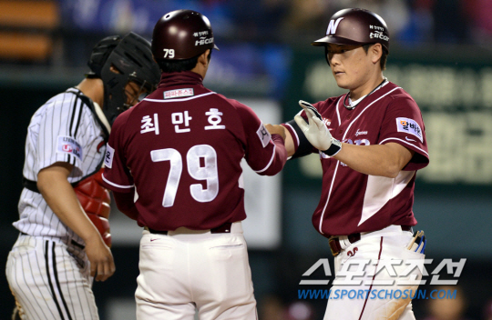 '엘넥라시코' LG와 넥센의 2013 프로야구 주중 3연전 첫 경기가 7일 잠실 야구장에서 열렸다. 넥센 이성열이 8회초 공격에서 우중월 솔로 홈런을 터뜨리고 최만호 코치와 하이파이브를 하고 있다. 잠실=조병관기자 rainmaker@sportschosun.com
