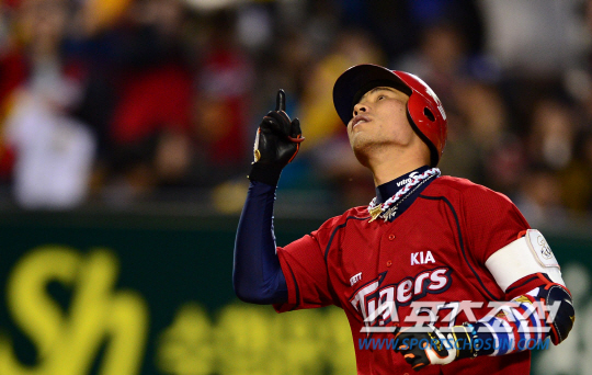 4월 30일 잠실야구장에서 열린 프로야구 두산과 KIA의 경기에서 KIA 김상현이 3회 시즌 2호 좌중월 투런포를 날렸다. 홈에 들어오며 세리머니를 펼치고 있는 김상현. 잠실=송정헌 기자 songs@sportschosun.com/2013.4.30 |