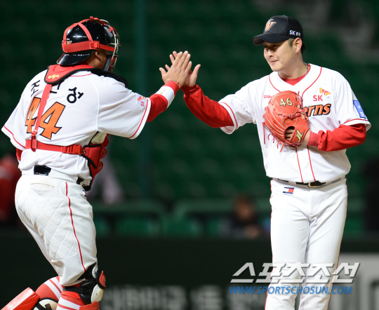 | 9일 인천구장에서 2013 프로야구 넥센과 SK의 경기가 열렸다. SK 송은범이 2-0으로 앞선 9회 등판해 무실점으로 팀승리를 지킨 후 조인성 포수와 하이피이브를 하고 있다. 인천=정재근 기자 cjg@sportschosun.com/2013.04.09 |