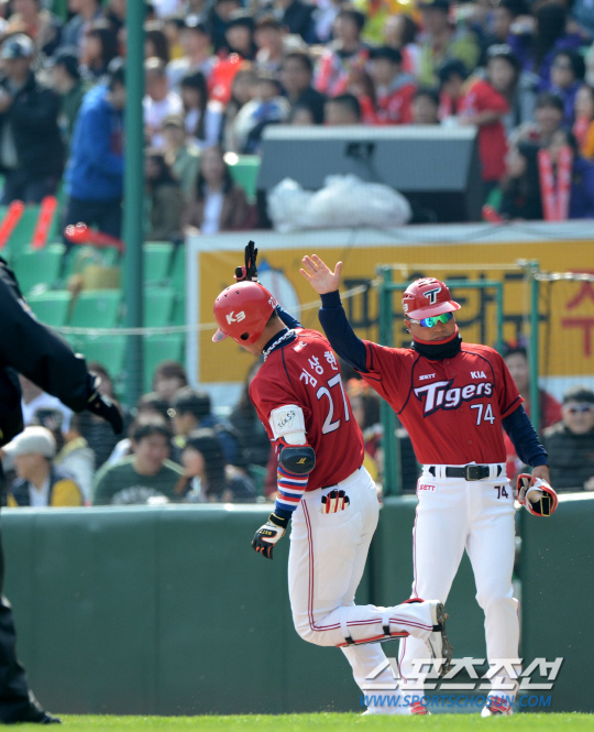 4월 30일 잠실야구장에서 열린 프로야구 두산과 KIA의 경기에서 KIA 김상현이 3회 시즌 2호 좌중월 투런포를 날렸다. 홈에 들어오며 세리머니를 펼치고 있는 김상현. 잠실=송정헌 기자 songs@sportschosun.com/2013.4.30
