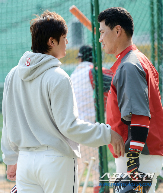 두산 베어스와 SK 와이번스의 2013 프로야구 경기가 8일 인천구장에서 열리는 가운데 양팀 선수들이 그라운드에 나와 훈련을 했다. SK 김상현이 두산 김선우와 만나 인사를 나누고 있다. 인천=정재근기자 cjg@sportschosun.com/2013.05.08/