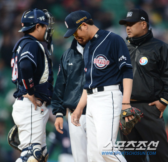 SK와이번스와 두산베어스의 2013 프로야구 경기가 7일 인천구장에서 열렸다. 두산 선발 이재우가 2회말 갑작스런 오른쪽 팔꿈치 통증을 호소하고 있다. 이재우는 결국 마운드를 내려갔다. 인천=정재근기자 cjg@sportschosun.com