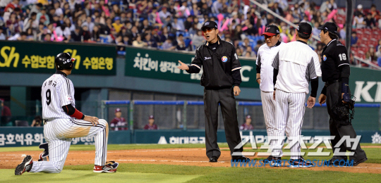 2013 프로야구 LG와 넥센의 주중 3연전 두번째 경기가 8일 잠실 야구장에서 펼쳐 졌다. LG 이병규가 6회 타석에서 넥센 박성훈의 투구에 맞았다며 1루에 나갔지만 심판진은 이를 인정하지 않았다. 이병규는 결국 외야플라이로 물러 났다. 잠실=조병관기자 rainmaker@sportschosun.com/2013.05.08/