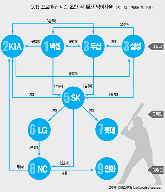 아직 시즌 초반이긴 하지만 흥미로운 먹이사슬 구도가 나타나고 있다. 우선 넥센, KIA와 삼성, 두산 등 상위 4강끼리 대결구도를 보면 KIA는 두산(3승3패), 넥센(3승2패)과 막상막하였다. 그나마 고전했다면 삼성전에서 1승2패를 한 것이다.
