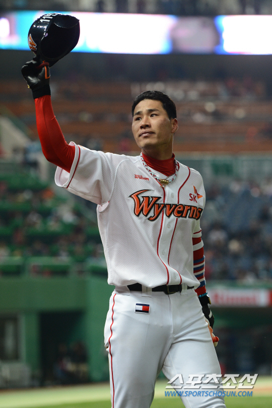 SK와이번스와 두산베어스의 2013 프로야구 경기가 7일 인천구장에서 열렸다. 8회말 무사 1루 SK 김상현이 좌월 투런포를 쏘아 올리고 들어와 모자를 벗어 팬에게 인사하고 있다. 인천=정재근기자 cjg@sportschosun.com/2013.05.07/ |