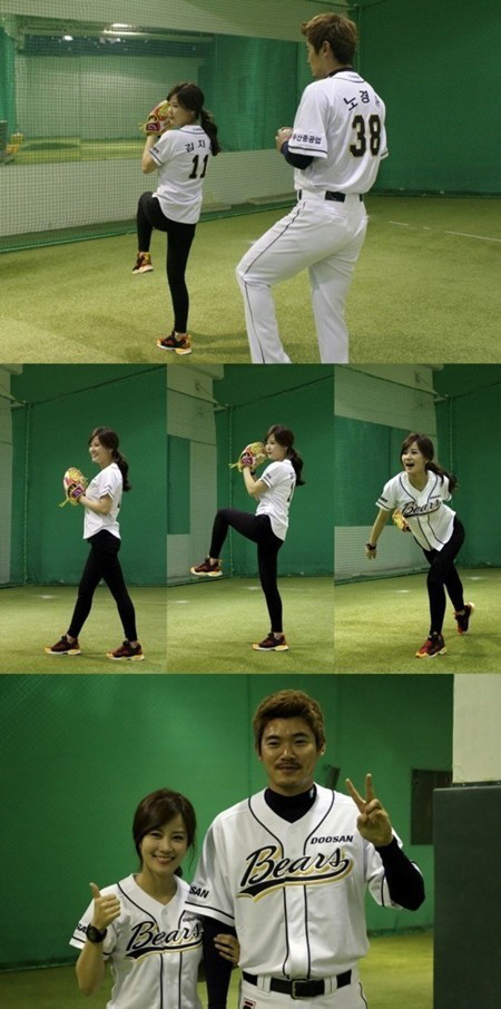 사진 속 김지민은 검정 스키니진에 두산 베어스의 유니폼을 입고 두산의 대표 투수 노경은 선수와 함께 진지한 모습으로 시구 연습에 임하고 있다. 날씬한 몸매와 여신 미모를 자랑한 김지민은 멋진 자세로 시선을 사로잡았다.