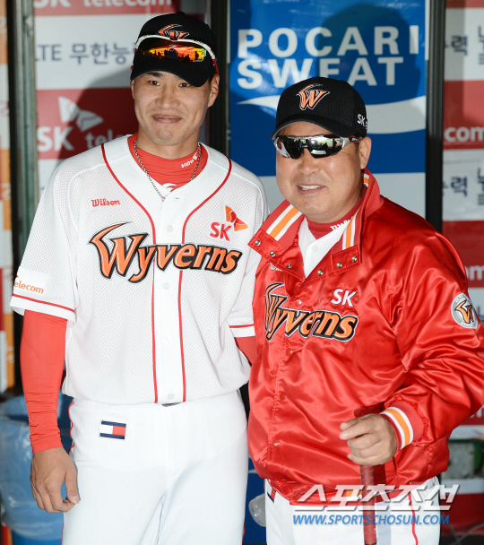 | KIA에서 SK로 이적한 김상현이 SK 유니폼을 입고 인천구장에 들어섰다. 7일 두산과 SK의 경기를 앞두고 김상현이 이만수 감독과 인사를 나누고 있다. 김상현은 지난 6일 투수 진해수와 함께 SK로 트레이드 됐다. SK에서는 송은범 신승현을 KIA로 보냈다. 7일 라인업에 김상현은 당당히 4번타자로 이름을 올렸다. 인천=정재근 기자 cjg@sportschosun.com/2013.05.07/ |