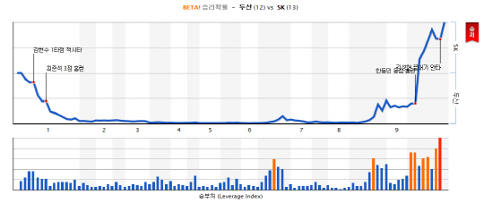 이후 SK가 5회말 1점을 따라 붙었지만, 남은 공격 기회가 줄어들면서 6회초가 끝난 시점에서 두산의 승리 확률은 99.7%가 됐다. SK가 역전에 성공할 확률이 0.3%에 불과했다는 뜻이다. 그런데 SK는 희박한 확률을 뛰어넘은 것이다.