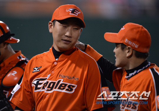 | 한화 김혁민이 14일 목동 넥센전에서 승리 투수가 된 뒤 이대수의 축하를 받고 있다. 목동=김경민 기자 kyungmin@sportschosun.com |