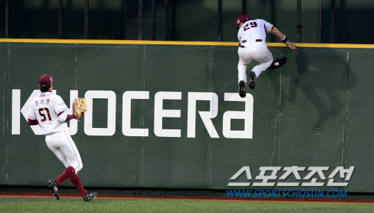 넥센과 한화의 2013 프로야구 주중 3연전 두번째 경기가 15일 목동구장에서 열렸다. 4회초 2사 1,2루 넥센 중견수 이택근이 한화 정현석의 타구를 잡아낸 후 부상을 방지하기 위해 펜스를 점프해 오르고 있다. 목동=허상욱 기자 wook@sportschosun.com