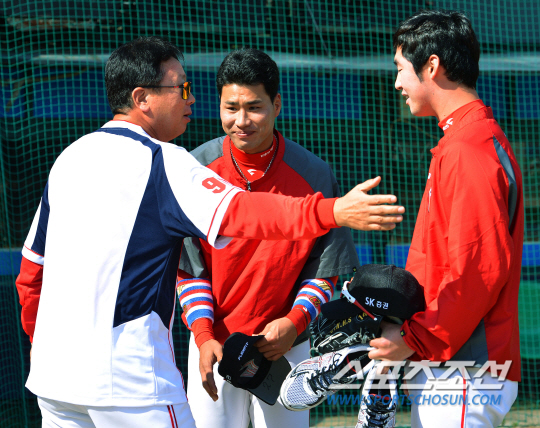 잠시 후 외야에서 투수조 훈련을 마친 송은범과 신승현이 덕아웃 쪽으로 왔다. 선 감독은 "너희들도 인사가야지"라면서 송은범에게 "가서 이 감독께 나도 감사하다고 꼭 전해드려라"라는 전언을 남겼다. 이 말에 호탕하게 웃은 송은범과 신승현은 SK 덕아웃으로 가 이 감독과 재회하고 돌아왔다.