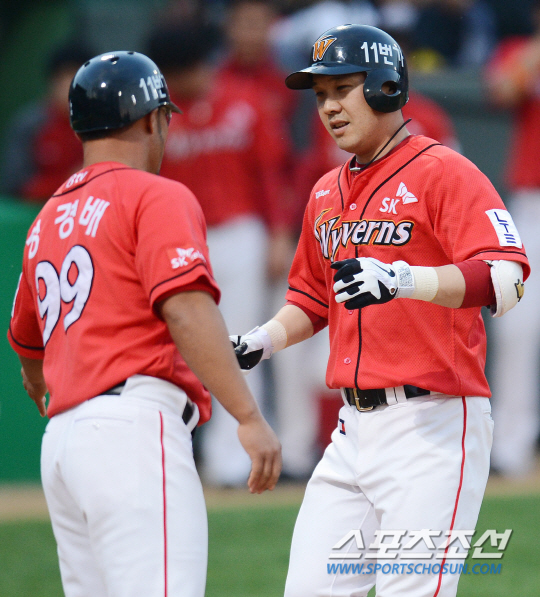 SK 와이번스와 KIA 타이거즈의 2013 프로야구 경기가 16일 광주구장에서 열렸다. 2회초 1사 SK 박진만이 조성우에 이어 백투백 홈런을 치고 들어오며 정경배 코치의 축하를 받고 있다. 광주=정재근기자 cjg@sportschosun.com/2013.05.16/