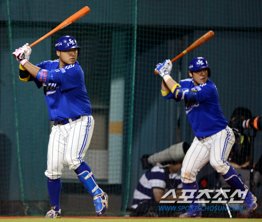 리그 2.3위를 달리고 있는 삼성과 두산의 2013 프로야구 주중 3연전 첫 경기가 14일 잠실 야구장에서 펼쳐 졌다. 삼성 박석민과 조동찬이 5회 두산 마운드가 홍상삼으로 바뀌어 연습투구를 하자 대기 타석에서 나란히 타이밍을 맞춰 보고 있다. 이들은 16일 잠실 두산전에 나란히 선발 명단에서 제외됐다. 잠실=조병관기자 rainmaker@sportschosun.com