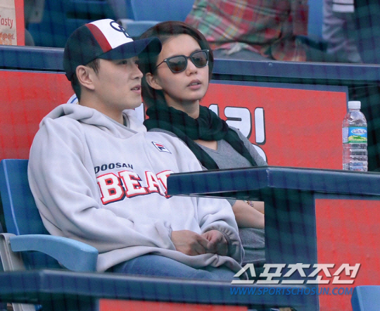 15일 오후 서울 잠실야구장에서 2013 프로야구 삼성과 두산의 경기가 열렸다. 탤런트 박시은과 연인 진태현이 두산 경기를 진지하게 관람중이다.