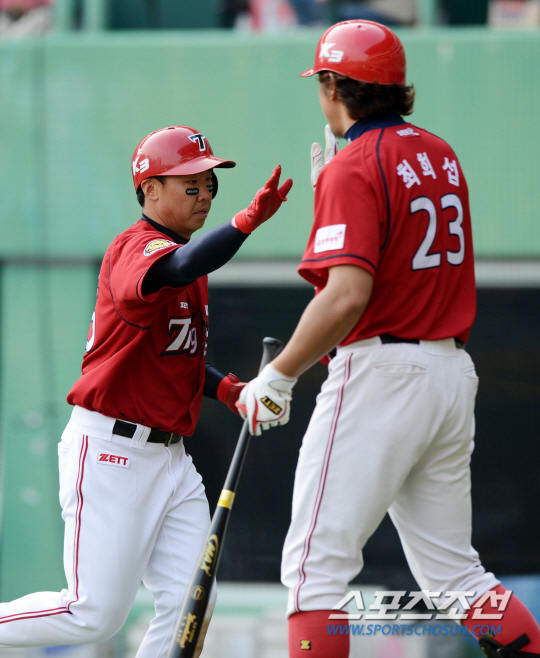 SK와 KIA의 2013 프로야구 주말 3연전 마지막날 경기가 21일 인천 문학구장에서 열렸다. 9회초 2사 KIA 이범호가 좌측담장을 넘어가는 솔로홈런을 치고 최희섭과 하이파이브를 하고 있다. 인천=허상욱 기자 wook@sportschosun.com/2013.04.21/