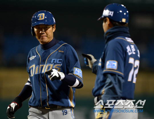 2013 프로야구 한화와 NC의 주중 3연전 마지막날 경기가 18일 대전구장에서 열렸다. 6회초 NC 박정준이 중전안타를 치고 전준호 1루 코치와 하이파이브를 하고 있다. 대전=허상욱 기자 wook@sportschosun.com/2013.04.18/ |