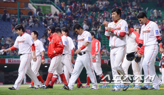 SK 와이번스와 롯데 자이언츠의 2013 프로야구 경기가 19일 인천 문학야구장에서 열렸다. SK 선수들이 롯데를 상대로 5대 11로 대패한후 경기장을 나서고 있다. 문학=최문영 기자 deer@sportschosun.com