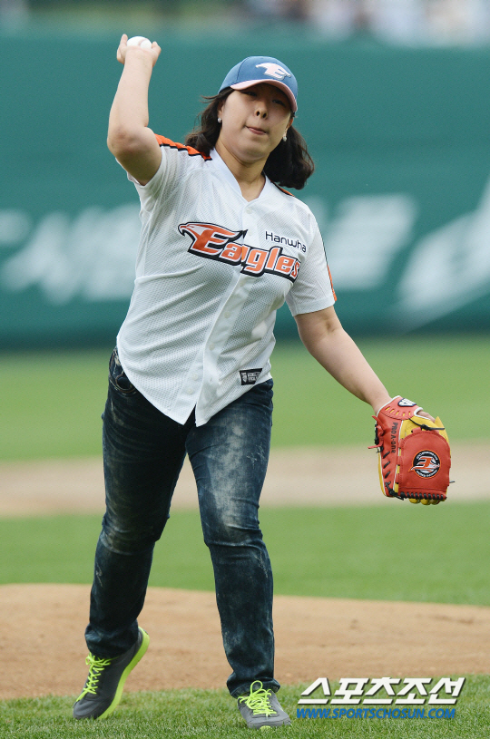 두산 베어스와 한화 이글스의 2013 프로야구 경기가 19일 대전구장에서 열렸다. 지난 4월 16일 시즌 첫 승리 때 관중석에서 많은 눈물을 흘리며 감동을 주었던 민효정 양이 시구를 하고 있다.